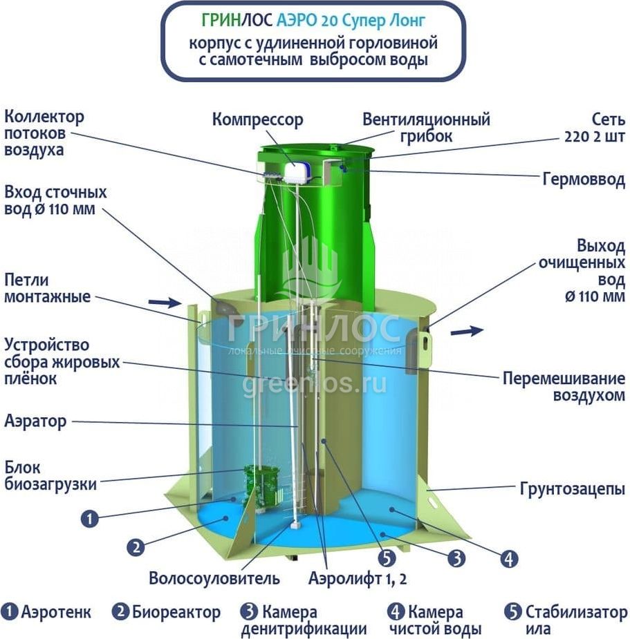 Станция ГРИНЛОС Аэро 20 Супер Лонг сконструирована таким образом, что все камеры, в которых происходит аэрация, разделение и осветление стоков объединены в одном корпусе цилиндрической или овальной формы.