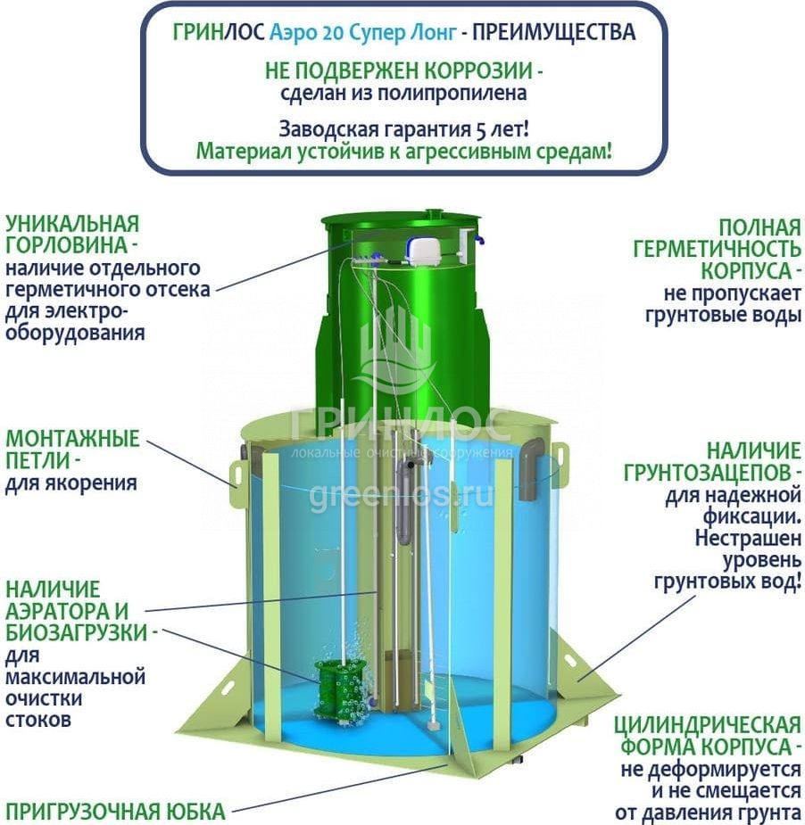 Естественный природный процесс в ГРИНЛОС Аэро 20 Супер Лонг оптимизирован путем аэрации стоков и установки биофильтра (специального устройства, на котором образуется биопленка из микроорганизмов). Благодаря использованию двух видов ила – свободного и фиксированного, достигается более высокая степень очистки, удлиняется временной интервал планового обслуживания.