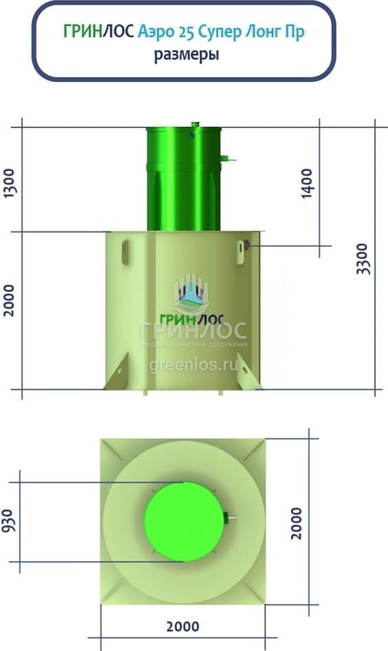 ГРИНЛОС Аэро 25 Пр Супер Лонг – это станция биологической очистки сточных вод аэрационного типа. Максимальный залповый сброс в септик равен 1500 л, а производительность станции равна 4 м3/сутки, что рассчитано на обслуживание 25 условных пользователей.