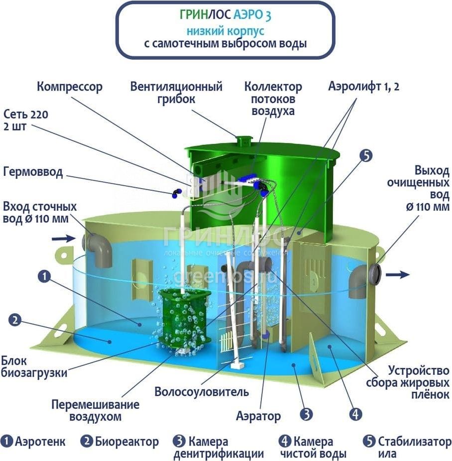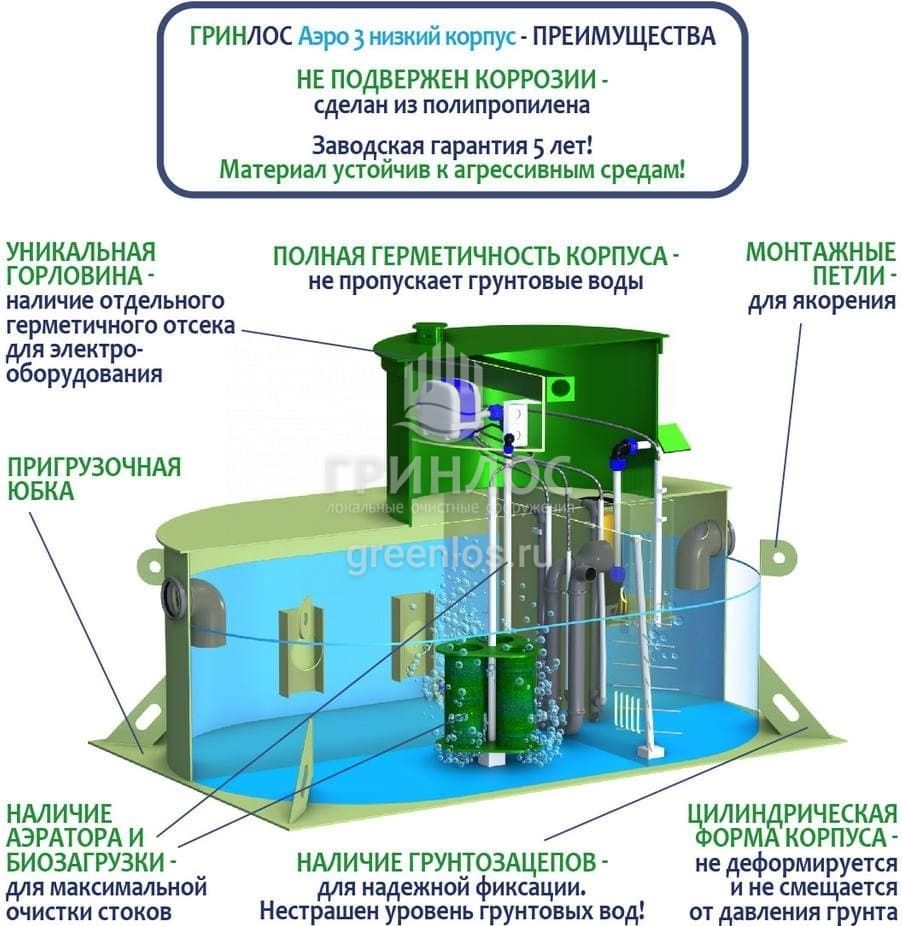 Отличительными особенностями септика ГРИНЛОС Аэро 3 низкий корпус являются: