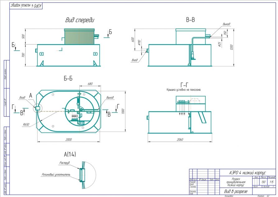 Конструкция септика ГРИНЛОС Аэро 4 Пр низкий корпус представляет из себя цилиндр с горловиной, выполненный из монолитного полипропилена. Внутри цилиндра с помощью перегородок выделены четыре камеры, последовательно сообщающиеся между собой через отверстия и патрубки в перегородках, расположенные на определенной высоте.