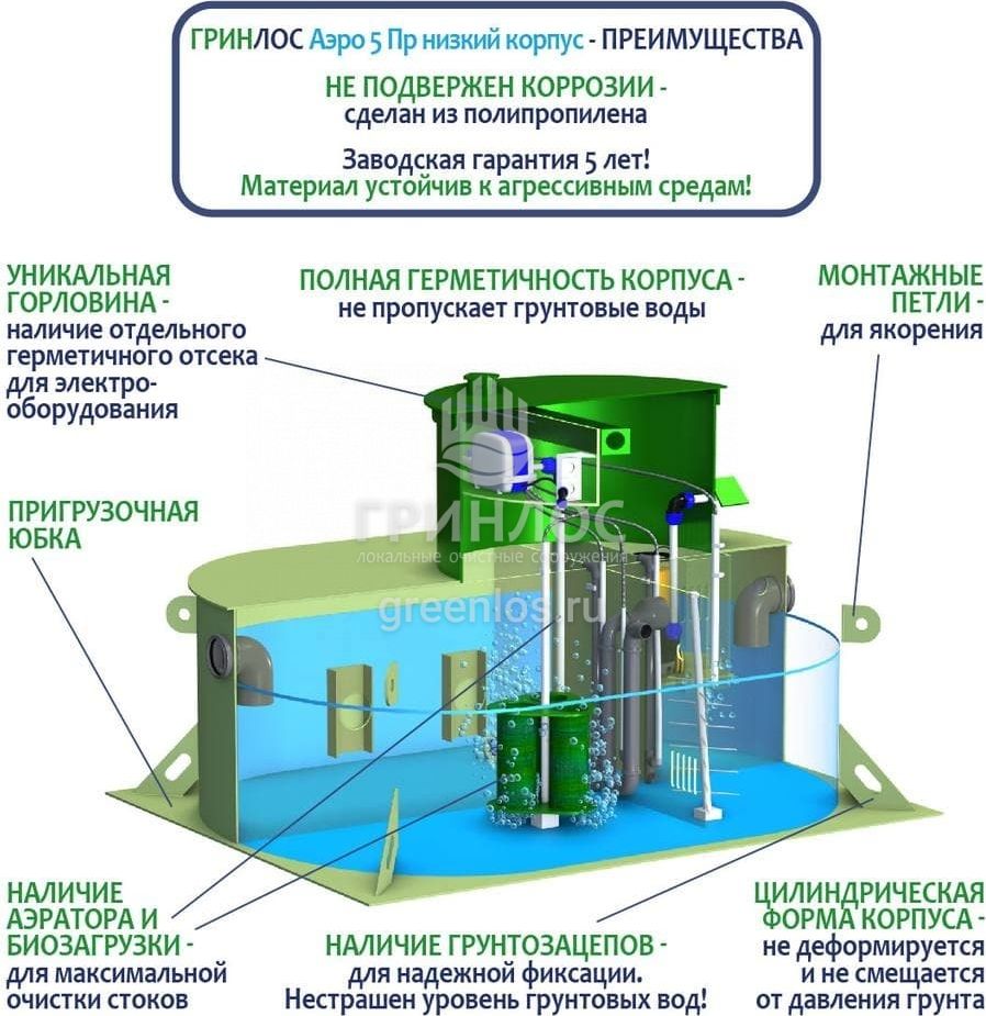 Отличительными особенностями септика ГРИНЛОС Аэро 5 низкий корпус Пр являются: