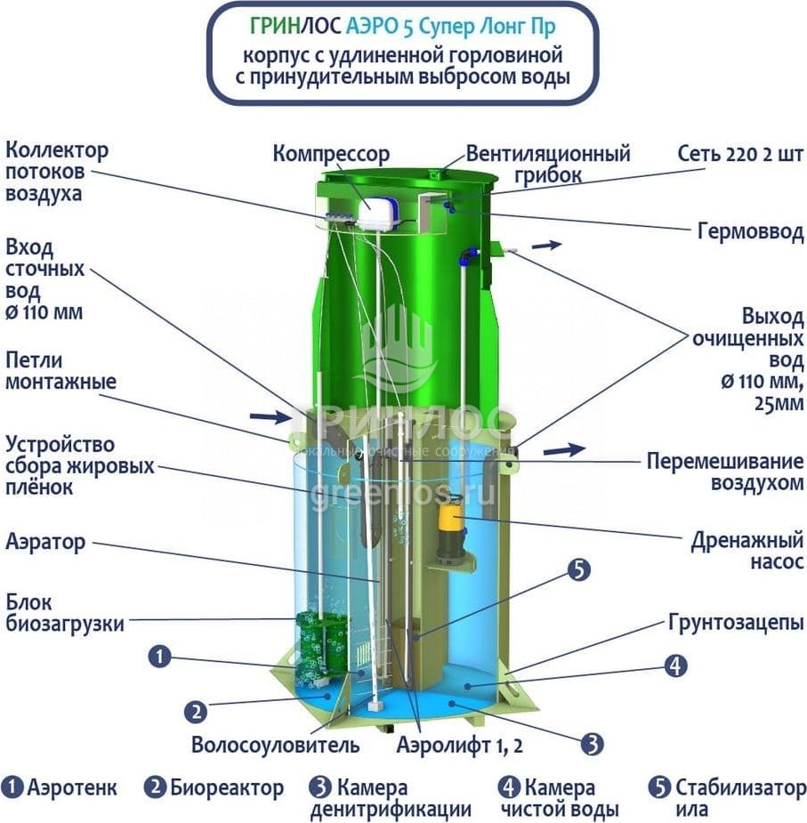 Станции биологической очистки ГРИНЛОС Аэро 5 Пр Супер Лонг предназначены для расщепления и переработки основных органических загрязнений, содержащихся в бытовых сточных водах. Эти процессы происходят в результате жизнедеятельности аэробных микроорганизмов, условия для жизнедеятельности которых создает ЛОС.