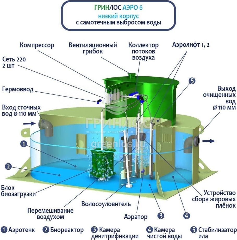 Естественный природный процесс в ГРИНЛОС Аэро 6 низкий корпус оптимизирован путем аэрации стоков и установки биофильтра (специального устройства, на котором образуется биопленка из микроорганизмов). Благодаря использованию двух видов ила – свободного и фиксированного, достигается более высокая степень очистки, удлиняется временной интервал планового обслуживания.