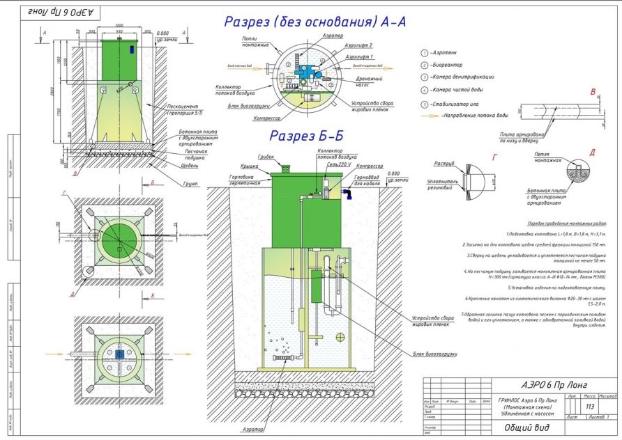 Станция ГРИНЛОС Аэро 6 Пр Лонг сконструирована таким образом, что все камеры, в которых происходит аэрация, разделение и осветление стоков объединены в одном корпусе цилиндрической или овальной формы.