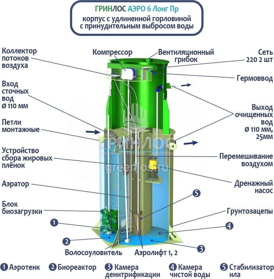 Станции биологической очистки ГРИНЛОС Аэро 6 Пр Лонг предназначены для расщепления и переработки основных органических загрязнений, содержащихся в бытовых сточных водах. Эти процессы происходят в результате жизнедеятельности аэробных микроорганизмов, условия для жизнедеятельности которых создает ЛОС.