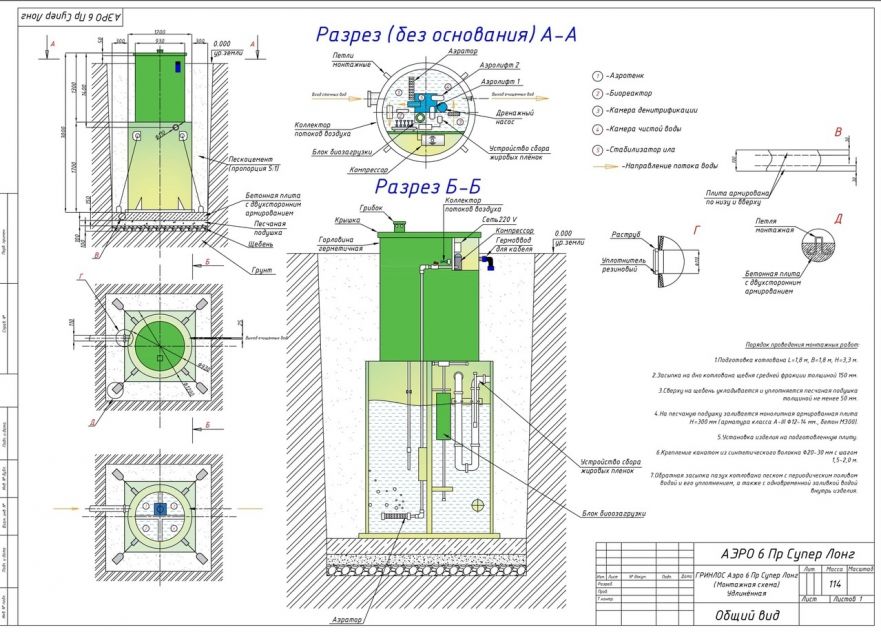 Станция ГРИНЛОС Аэро 6 Пр Супер Лонг сконструирована таким образом, что все камеры, в которых происходит аэрация, разделение и осветление стоков объединены в одном корпусе цилиндрической или овальной формы.