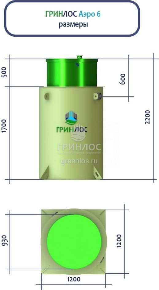 ГРИНЛОС Аэро 6 — это самотечная модель аэрационной установки биологической очистки с залповым сбросом 540 л и производительностью 1.2 м3/сутки, что делает его подходящим для домов, в которых число жильцов не превышает 6 условных пользователей.