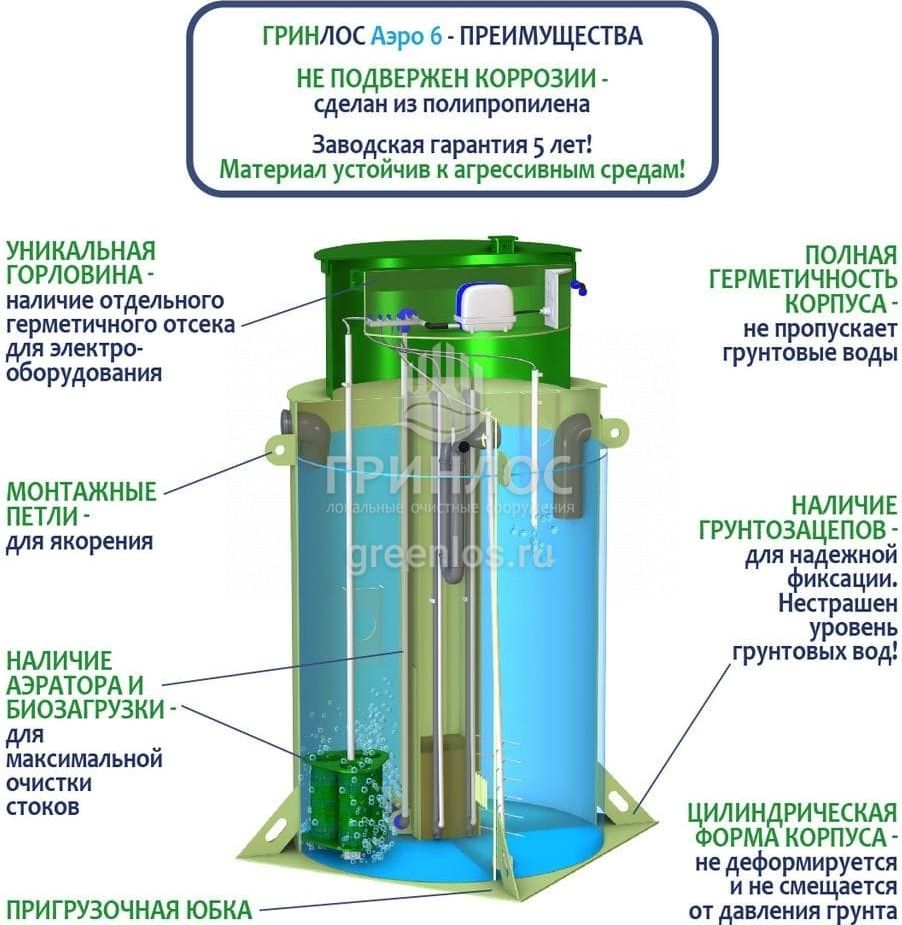 Отличительными особенностями септика ГРИНЛОС Аэро 6 являются: