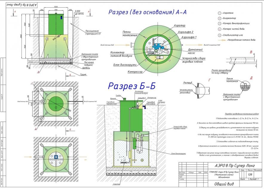 Станция ГРИНЛОС Аэро 8 Пр Супер Лонг сконструирована таким образом, что все камеры, в которых происходит аэрация, разделение и осветление стоков объединены в одном корпусе цилиндрической или овальной формы.
