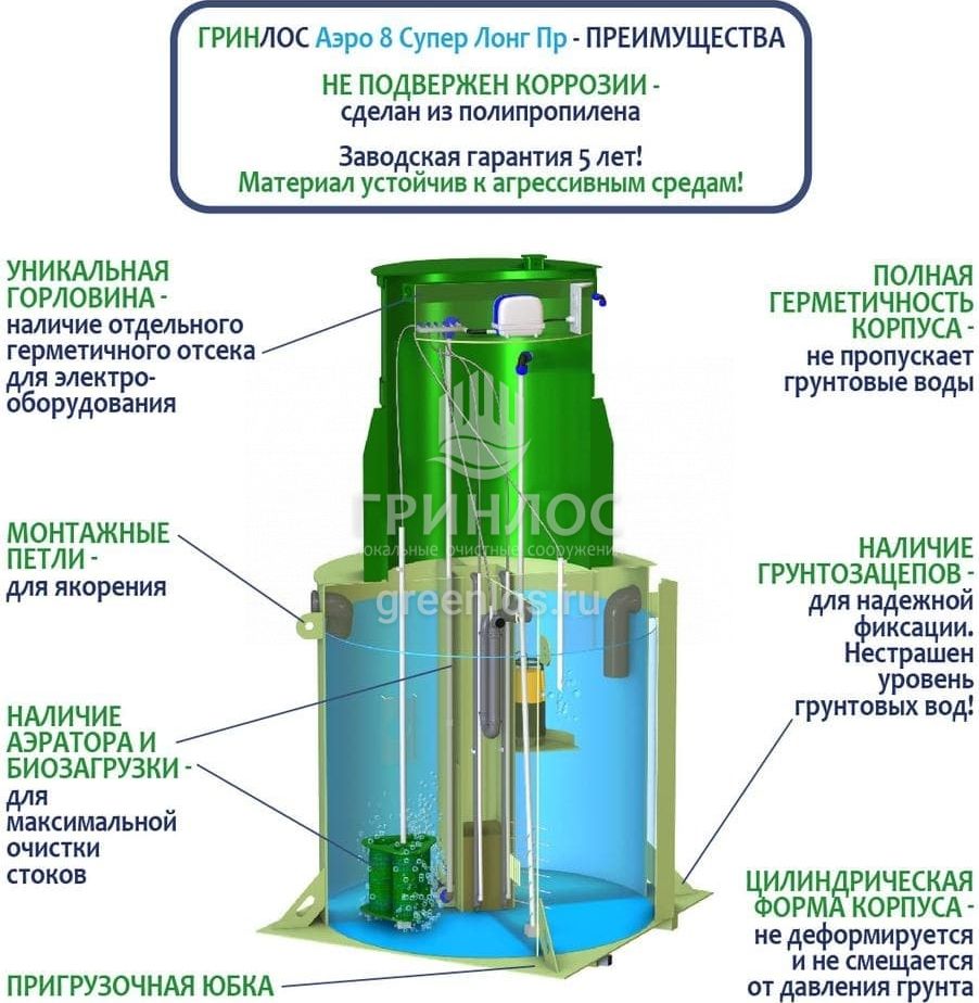 Станции биологической очистки ГРИНЛОС Аэро 8 Пр Супер Лонг предназначены для расщепления и переработки основных органических загрязнений, содержащихся в бытовых сточных водах. Эти процессы происходят в результате жизнедеятельности аэробных микроорганизмов, условия для жизнедеятельности которых создает ЛОС.
