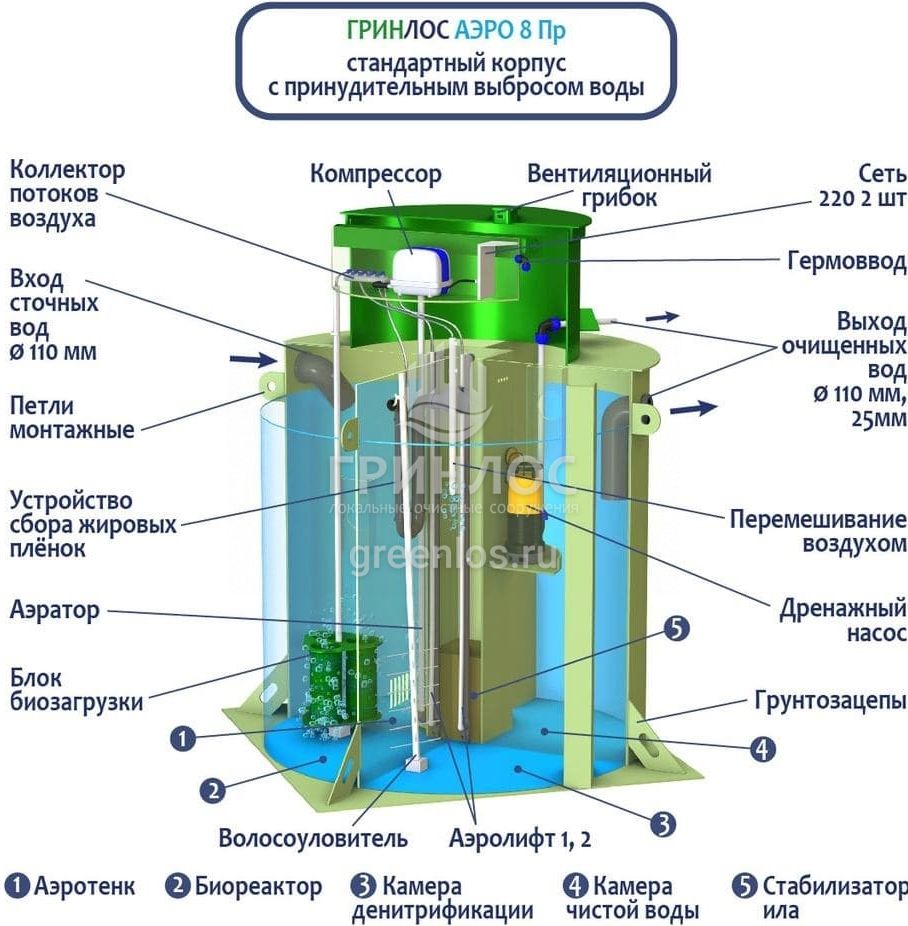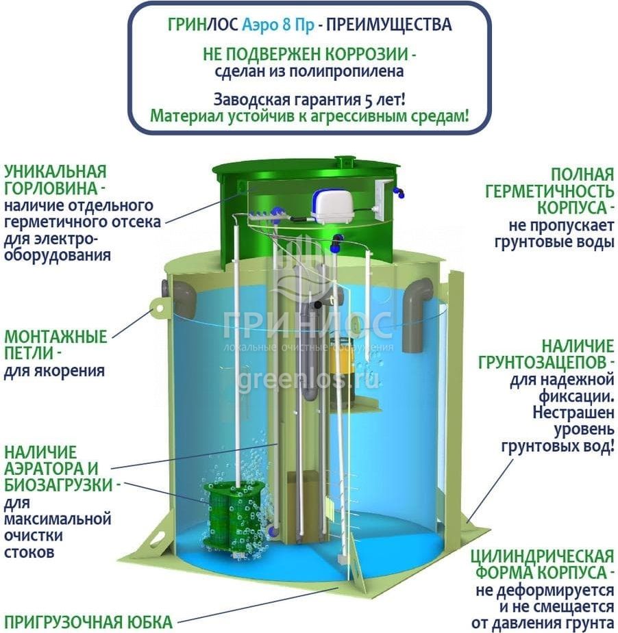 Отличительными особенностями септика ГРИНЛОС Аэро 8 Пр являются: