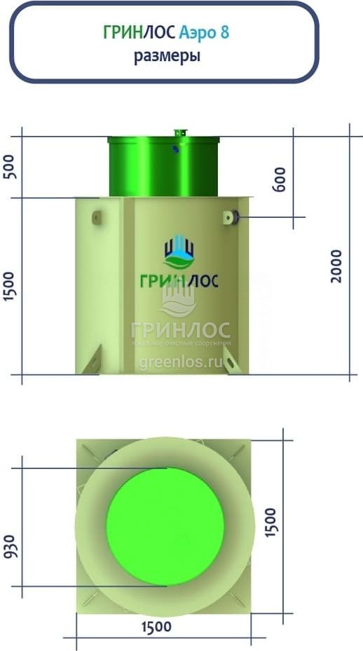 ГРИНЛОС Аэро 8 — это самотечная модель аэрационной установки биологической очистки с залповым сбросом 710 л и производительностью 1.4 м3/сутки, что делает его подходящим для домов, в которых число жильцов не превышает 8 условных пользователей.