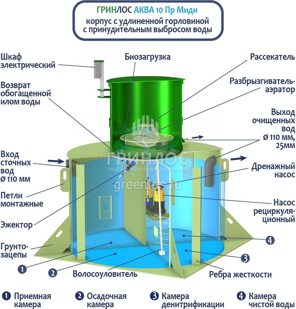 Станции очистки ГРИНЛОС Аква 10 Пр Миди предназначены для расщепления и переработки основных органических загрязнений, содержащихся в бытовых сточных водах. Попадая в септик и перемещаясь между камерами в корпусе, нечистоты последовательно проходят этапы усреднения, разделения и отстаивания, разделения на фракции (физическая переработка), а также взаимодействуют с бактериями из биозагрузки (биологическая переработка). Далее стоки усредняются и отстаиваются. Осветленная вода выводится наружу самотечным или принудительным образом.