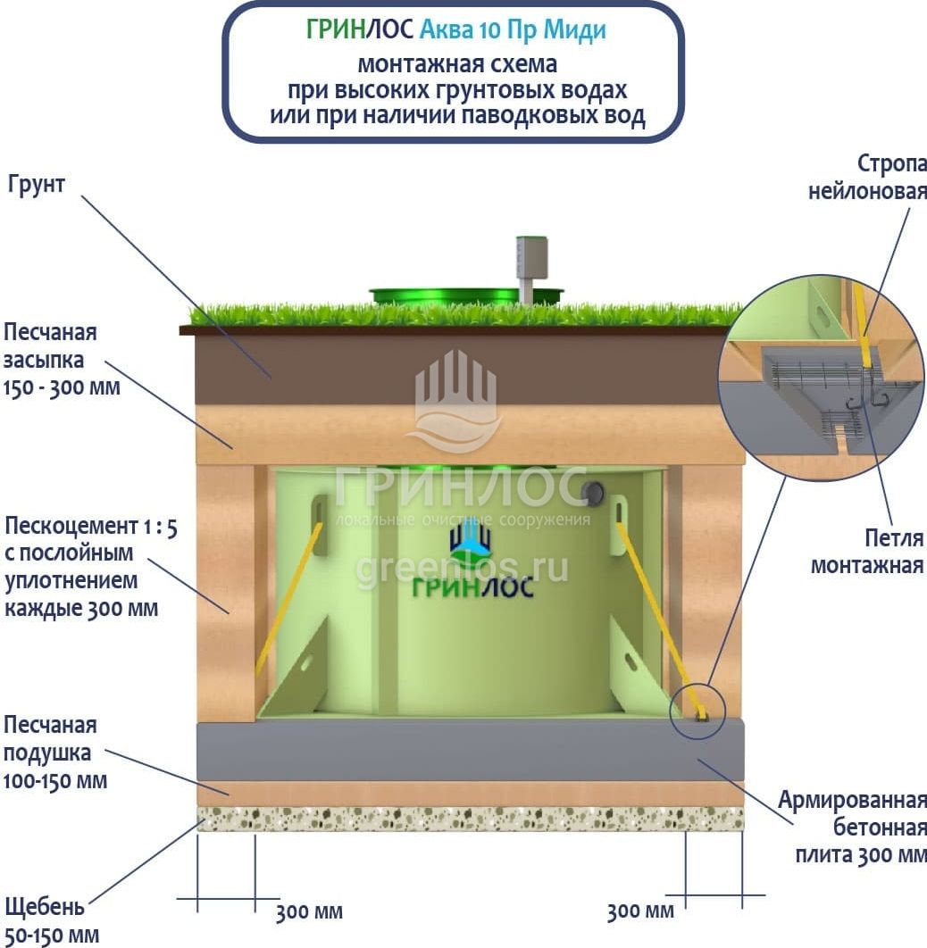 Станции очистки ГРИНЛОС обладают надежными грунтозацепами, действительно предотвращающими всплытие оборудования на обводненных участках.