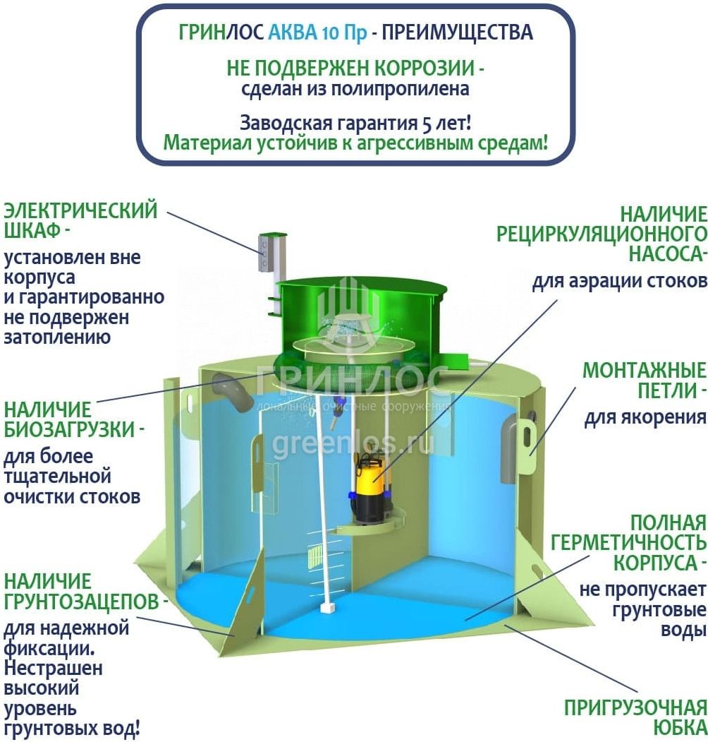 Отличительными особенностями септика ГРИНЛОС Аква 10 Пр являются: