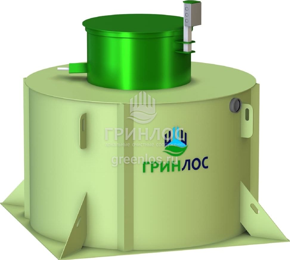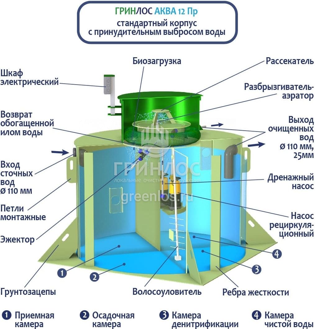 ГРИНЛОС Аква 12 Пр — это септик, который оснащен насосом. Обладает объемом залпового сброса 980 л и производительностью 2.5 м3/сутки, что делает его подходящим для домов, в которых число жильцов не превышает 12 условных пользователей. Оснащен фильтром грубой очистки и двумя насосами на полке.