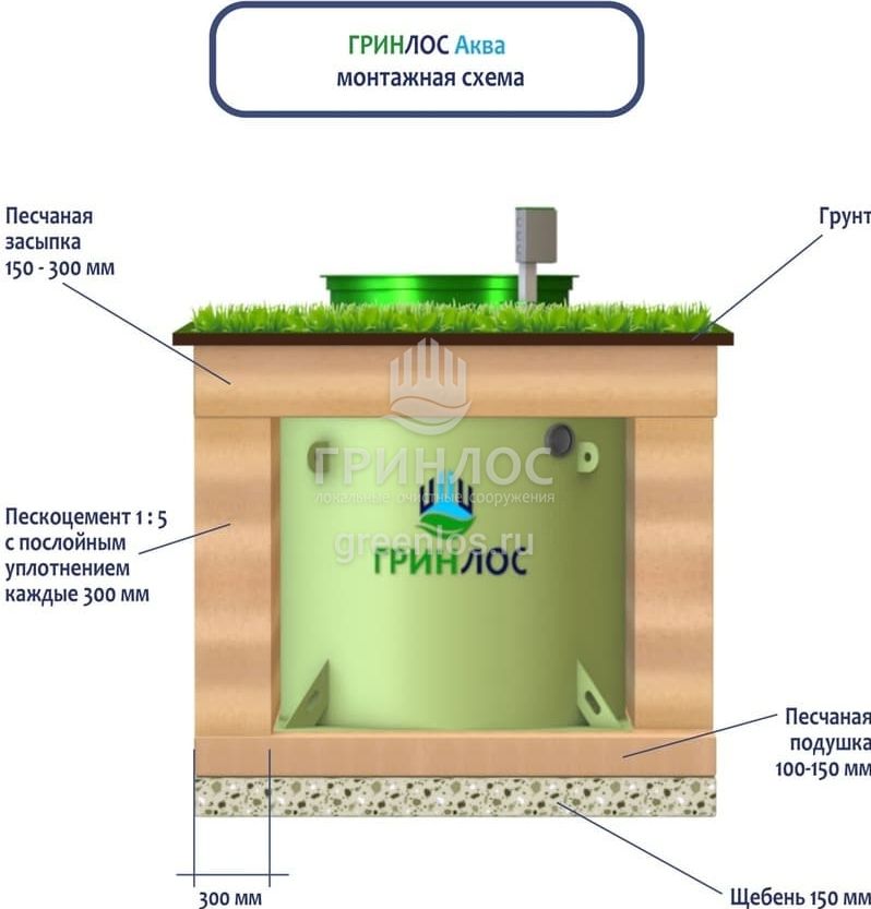 - Высота корпуса — 1900 мм. Станция подходит для монтажа во все виды почв: песок, глина, суглинок, грунты с высоким уровнем грунтовых вод.