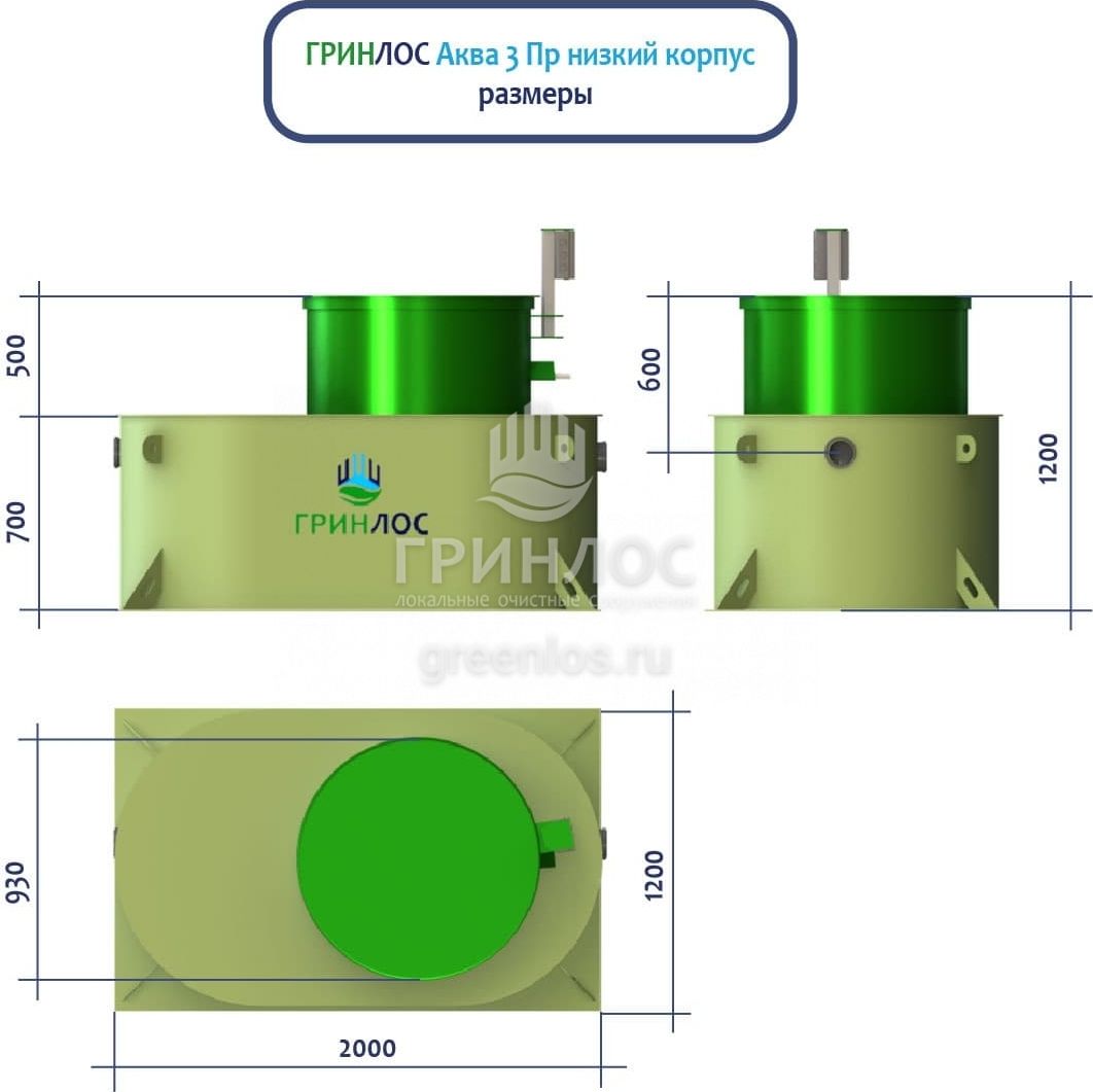 ГРИНЛОС Аква 3 низкий корпус Пр — модель септика с уменьшенной высотой корпуса, оснащенная насосом. Обладает объемом залпового сброса 240 л и производительностью 0.6 м3/сутки, что делает его подходящим для домов, в которых число жильцов не превышает 3 условных пользователей.