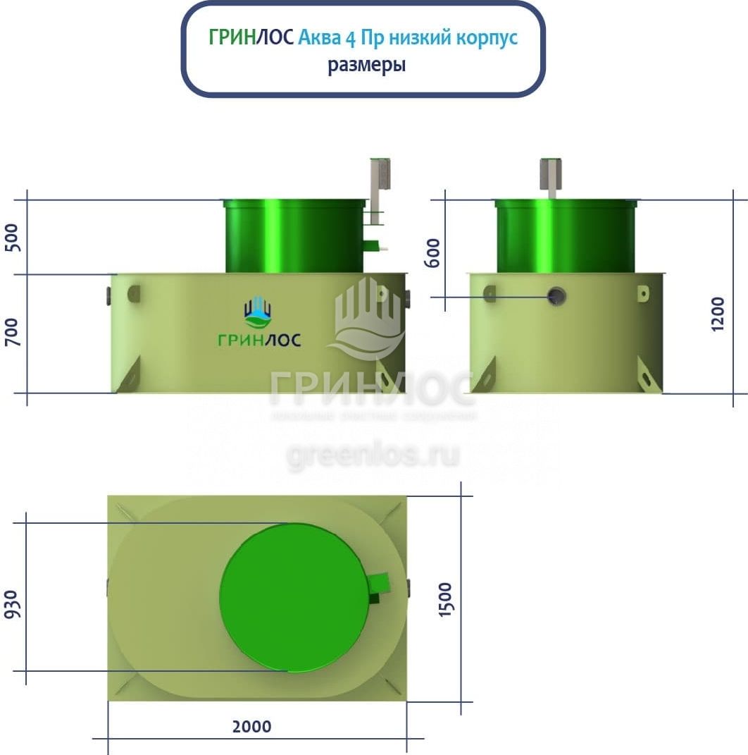 ГРИНЛОС Аква 4 низкий корпус Пр — модель септика с уменьшенной высотой корпуса, оснащенная насосом. Обладает объемом залпового сброса 340 л и производительностью 0,8 м3/сутки, что делает его подходящим для домов, в которых число жильцов не превышает 4 условных пользователей.