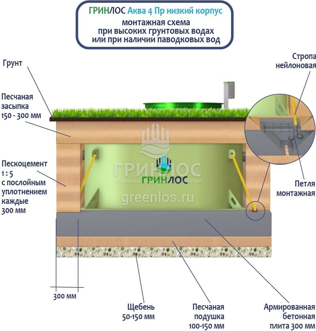 Станции очистки ГРИНЛОС обладают надежными грунтозацепами, действительно предотвращающими всплытие оборудования на обводненных участках.