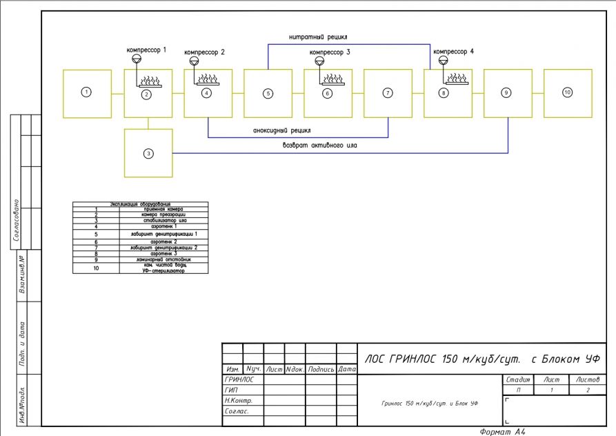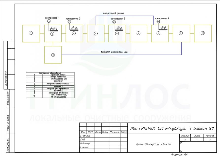 ГРИНЛОС БМ 150– это очистное сооружение производительностью 42 м3 в сутки, состоящее из нескольких разнофункциональных блоков, находящихся в специально сконструированном корпусе длиной 6 метров и высотой 2,58 метров, предназначенных для полной очистки промышленных, бытовых и ливневых стоков от любых видов загрязнений.