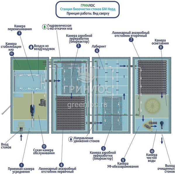 Септик Гринлос БМ Норд 300 работает на основе биологической очистки сточных вод с помощью активного ила. Для эффективной работы важно поддерживать благоприятные условия для микроорганизмов.