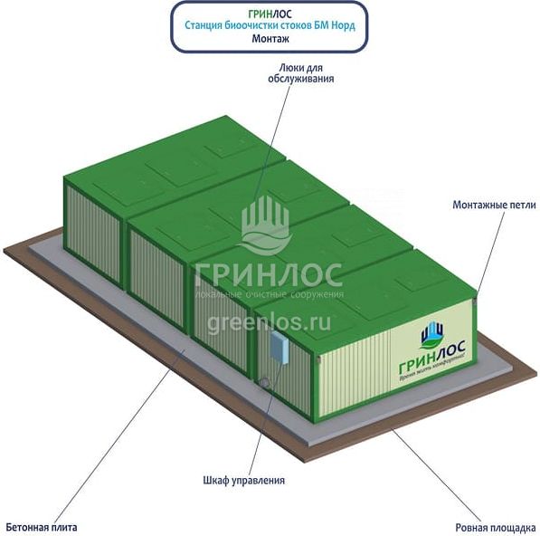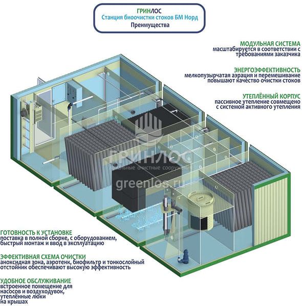 Морозостойкий септик Гринлос БМ Норд 300 обладает производительностью 54 м3/сут и рассчитан на 300 человек. Наземное размещение и модульная конструкция позволяют гибко наращивать мощность и упрощают монтаж.