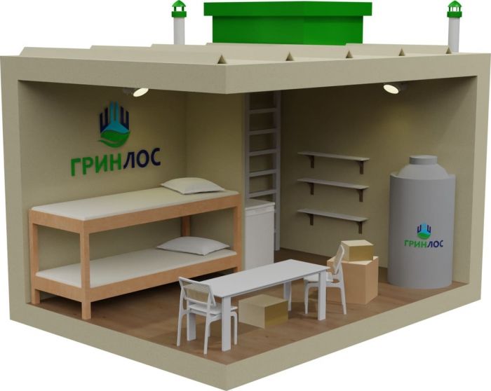 ГРИНЛОС Бункер 3000*2300*2000 — это герметично закрываемое помещение полной заводской готовности, перед эксплуатацией заглубляемое под землю. Внешние размеры данной модели составляют 3* 2.3* 2400 мм с учетом входа. Бункер оборудован освещением, системой приточной и вытяжной вентиляции, полками и емкостями для хранения, а также бытовым оборудованием.