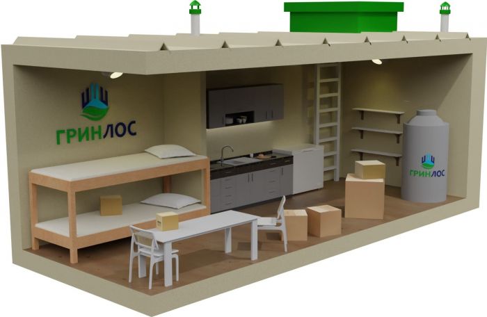 ГРИНЛОС Бункер 5000*2000*2000 — это герметично закрываемое помещение полной заводской готовности, перед эксплуатацией заглубляемое под землю. Внешние размеры данной модели составляют 5* 2* 2400 мм с учетом входа. Бункер оборудован освещением, системой приточной и вытяжной вентиляции, полками и емкостями для хранения, а также бытовым оборудованием.
