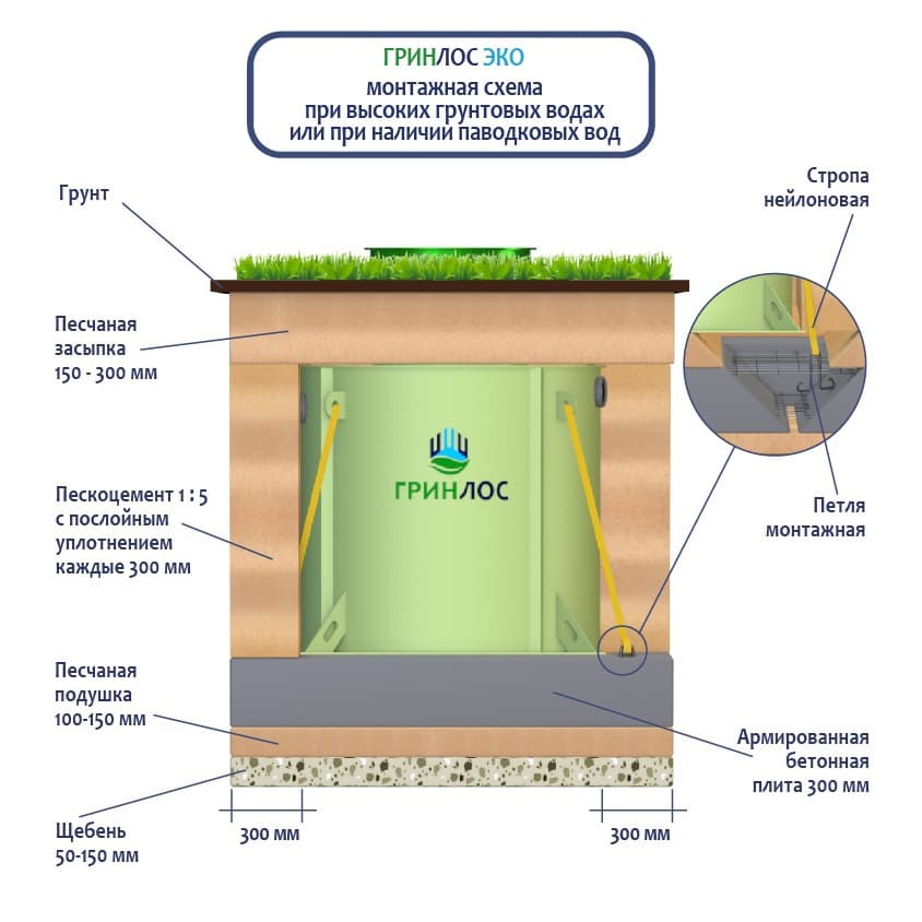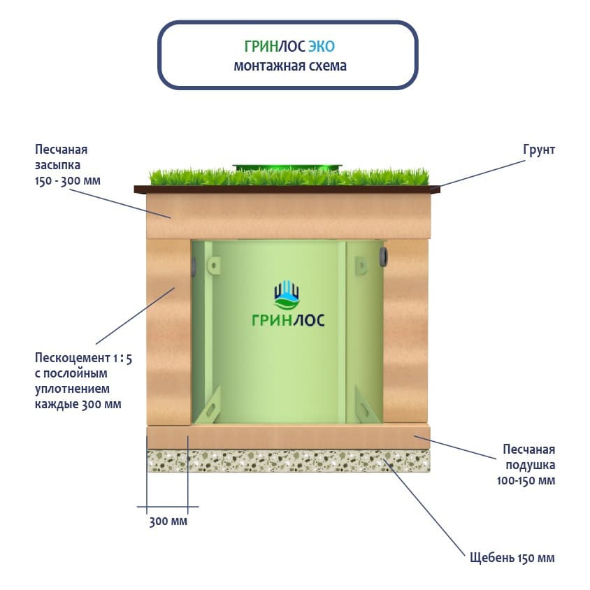 Благодаря равномерному распределению давления грунта на цилиндрический корпус, ГРИНЛОС Эко не деформируется даже без опалубки и подходит для установки в сложных грунтах.