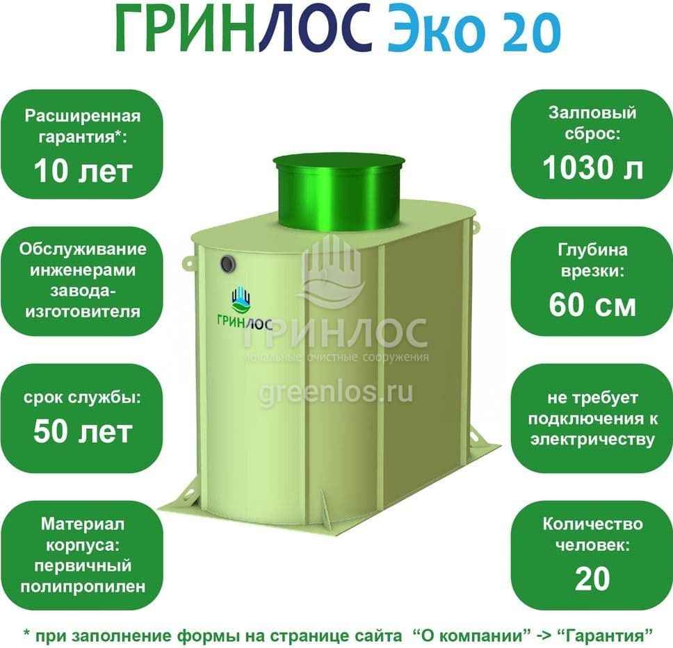 ГРИНЛОС Эко 20 — это энергонезависимый септик с залповым сбросом 1000 л и производительностью 4 м3/сутки, что делает его подходящим для домов, в которых число жильцов не превышает 20 условных пользователей.