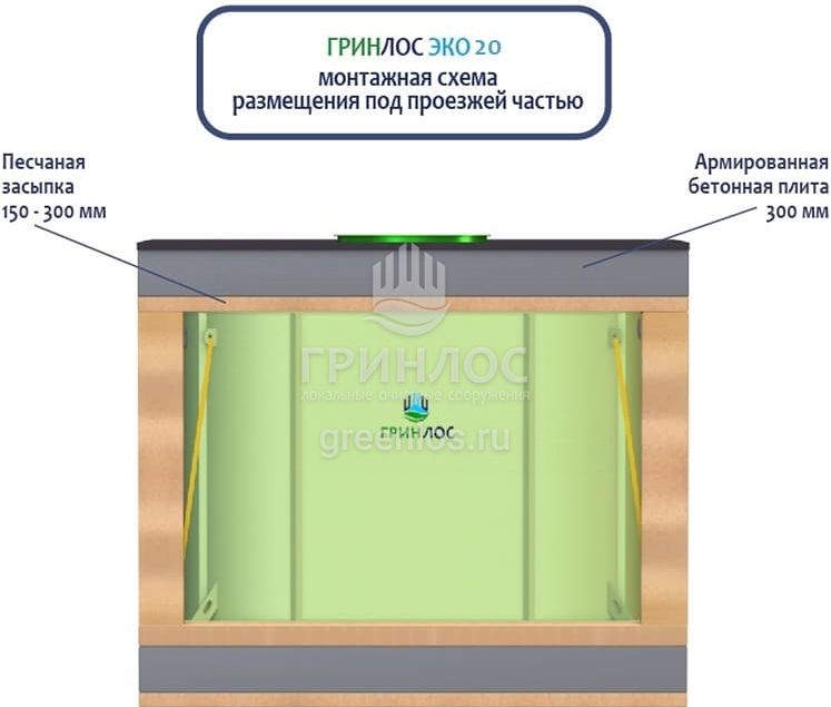 Септик глубокой биохимической переработки хозяйственно-бытовых сточных вод ГРИНЛОС Эко 20 следует располагать так, чтобы к ней мог беспрепятственно подъехать ассенизационный автомобиль. При этом над отстойником и над Септиком ГРИНЛОС Эко в радиусе 2,5 м не допускается движение и стоянка автотранспорта. При необходимости организации стоянки или проезда автотранспорта, необходимо оборудовать разгрузочную плиту над очистным сооружением и над подводящей и отводящей трассами.