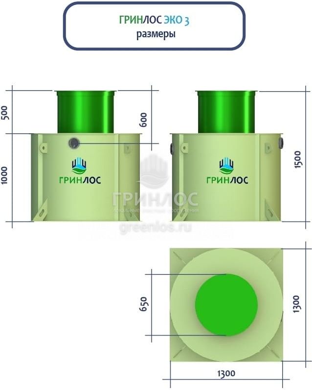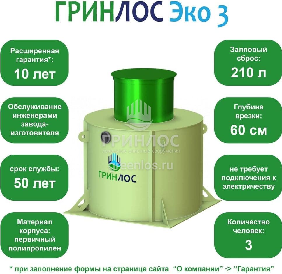 ГРИНЛОС Эко 3 — это энергонезависимый септик с залповым сбросом 180 л и производительностью 0.6 м3/сутки, что делает его подходящим для домов, в которых число жильцов не превышает 3 условных пользователей.