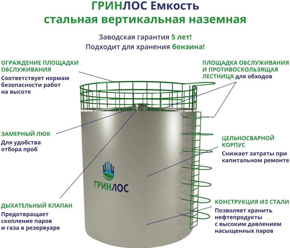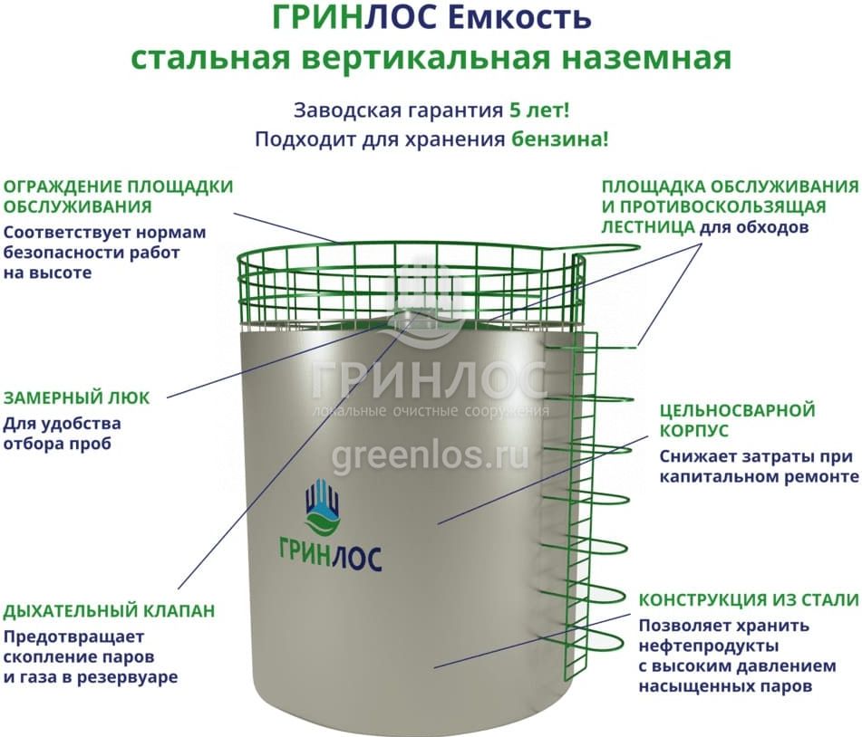 - Технический паспорт «ГРИНЛОС Резервуар стальной наземный»;