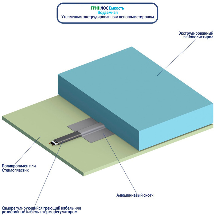 Утепление листовым экструдированным пенополистиролом включает многослойную защиту: внутреннюю полипропиленовую или стеклопластиковую емкость, греющий кабель с терморегулятором, слой из листов XPS, алюминиевый скотч, а в наземных вариантах – также битумно-полимерную мастику и адгезионный праймер.