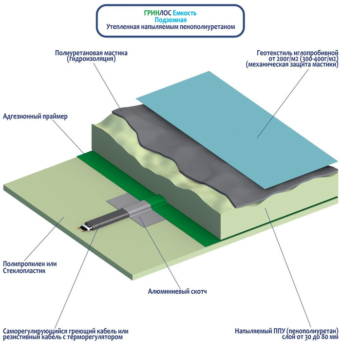 - При подземном размещении: полиуретановая мастика (гидроизоляционный слой) + геотекстиль (защита мастики от механических повреждений)