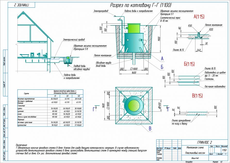 Монтаж кессона ГРИНЛОС Кессон 2 начинается с планировки котлована. Выполнять данную работу необходимо учитывая эксцентриситет отверстия в дне кессона и с учётом направленности водопровода.