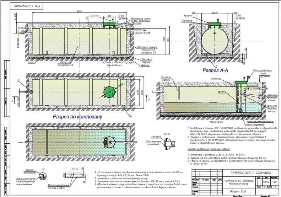Требования к Гринлос КНС В-2000/1000, особенности установки и обустройства санитарной зоны, необходимое количество трубопроводов регулирует СНиП 2.04.01-85 «Внутренний водопровод и канализация зданий».