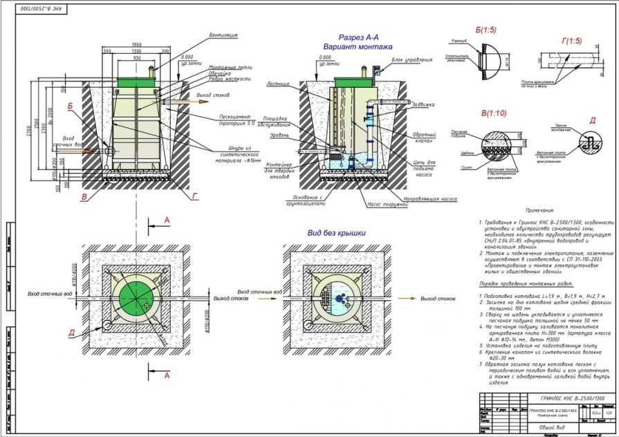 Процесс монтажа Гринлос Гринлос КНС В-2500/1300 выполняется в несколько обязательных этапов. Они включают в себя: