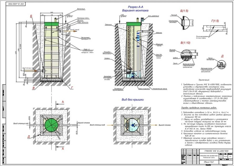 Процесс монтажа Гринлос Гринлос КНС В-4000/1000 выполняется в несколько обязательных этапов. Они включают в себя: