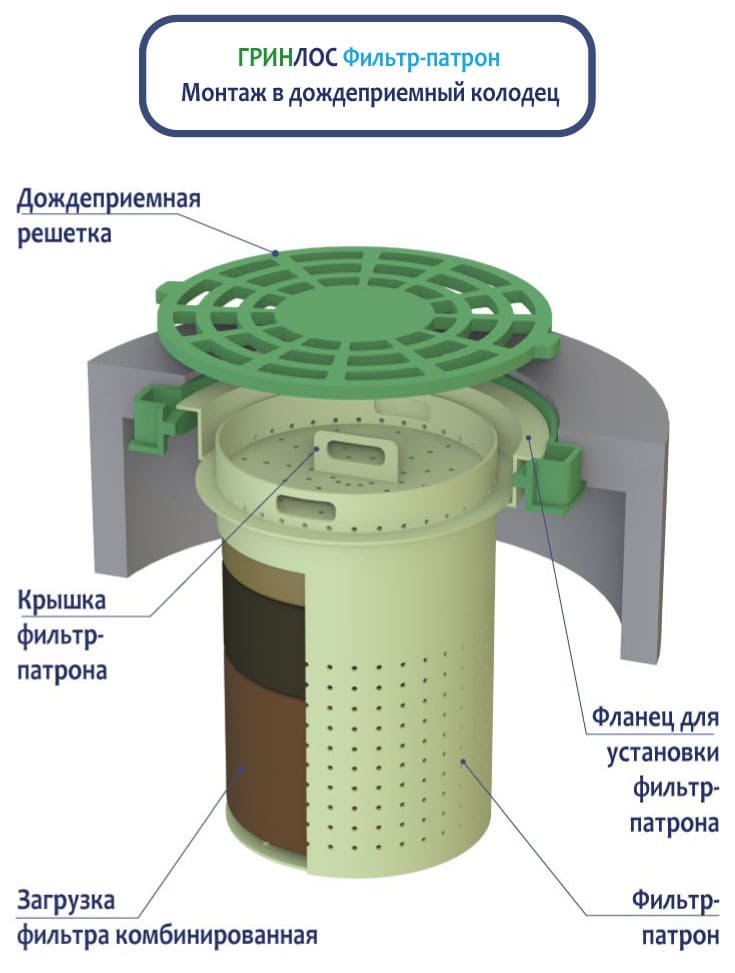 К заказу доступны два варианта исполнения: колодец с установленным фильтр-патроном и отдельный фильтр патрон для установки в уже существующий или строящийся ливневый колодец.