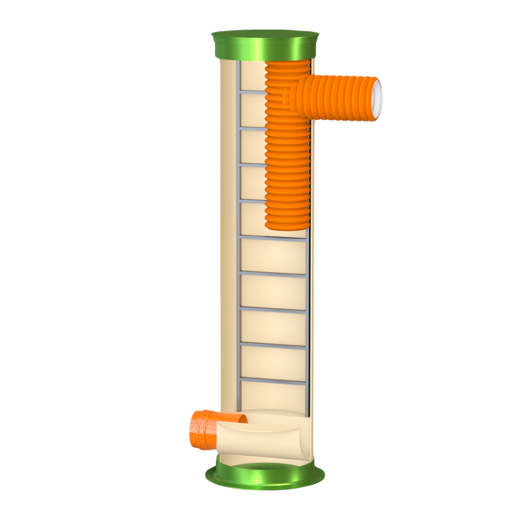 Перепадный колодец ГРИНЛОС Пп 800/3500 представляет собой современное и надежное решение для различных инженерных сетей. Его внутреннее устройство разработано для обеспечения максимальной функциональности, герметичности и долговечности при эксплуатации. Основные элементы перепадного канализационного колодца Гринлос Пп 800/3500: