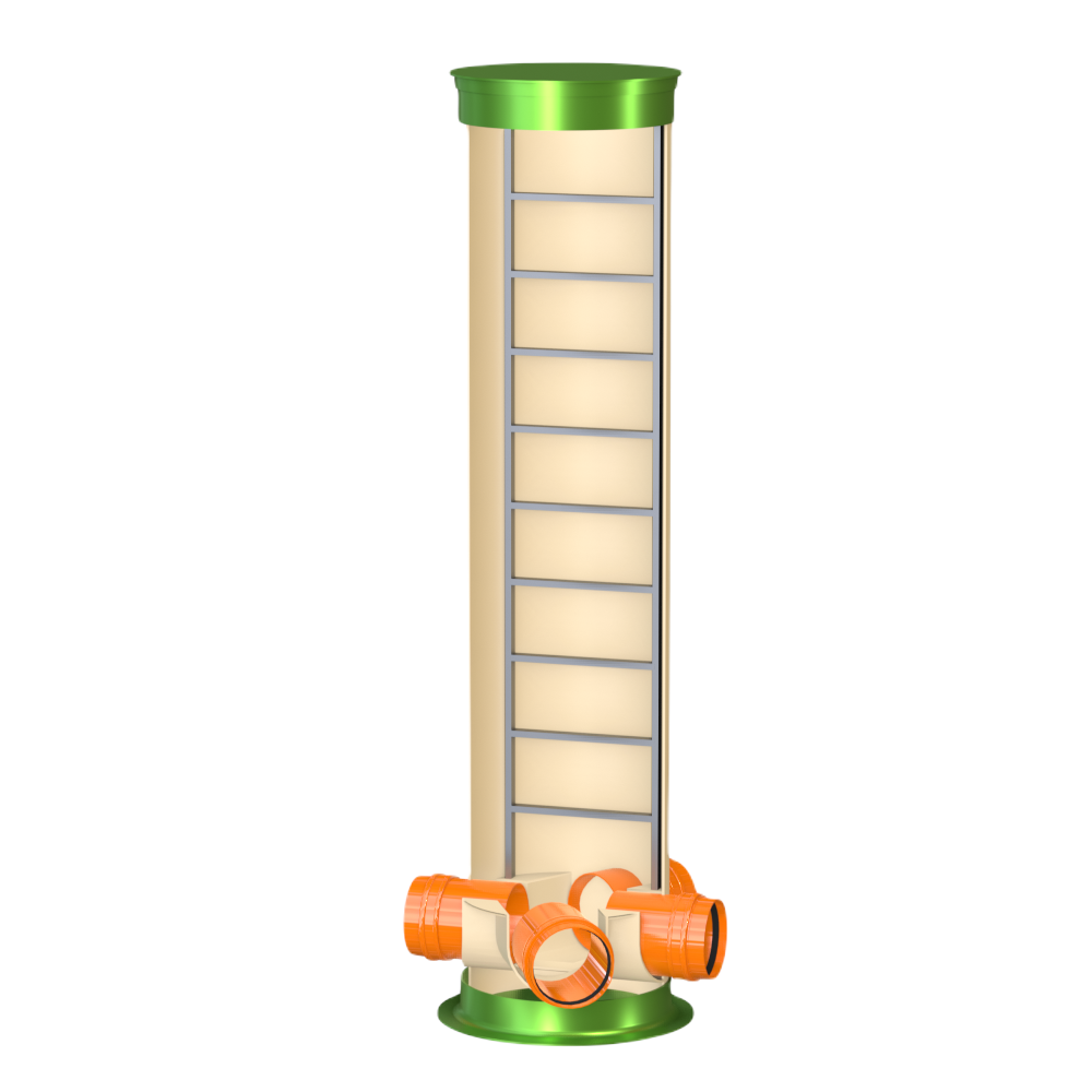 Узловой колодец ГРИНЛОС У 800/3500 устанавливается в местах соединения различных потоков. Такие колодцы могут выполнять функции как поворотных, так и перепадных колодцев одновременно. Чаще всего узловой колодец используется в качестве распределительного в системах очистных сооружений, которые состоят из нескольких модулей, для равномерного распределения потока между этими модулями.