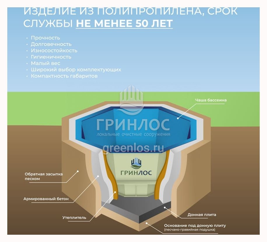 ГРИНЛОС Купель 2000*2000*1000 Восьмиугольная поставляется в едином пластиковом корпусе, к которому прилагается Технический паспорт. Полипропиленовый корпус весьма прочен и не боится перепадов температур, влажности, коррозии, химически агрессивных веществ. Все эти особенности гарантируют долгий срок службы купели.