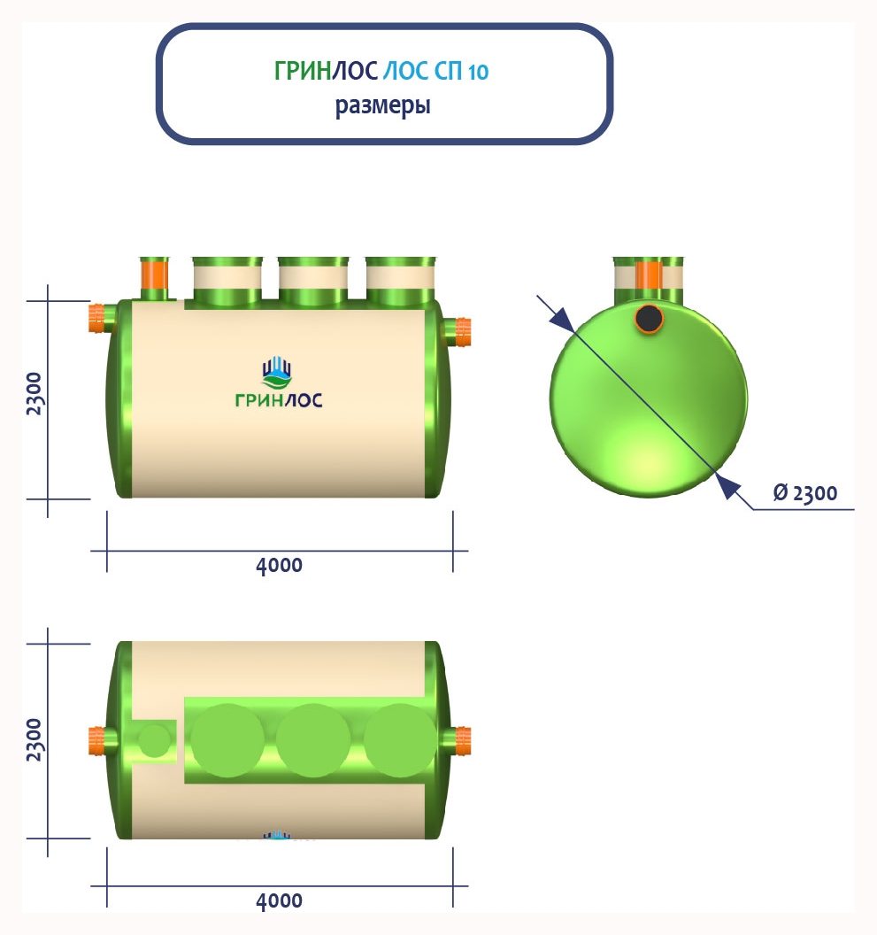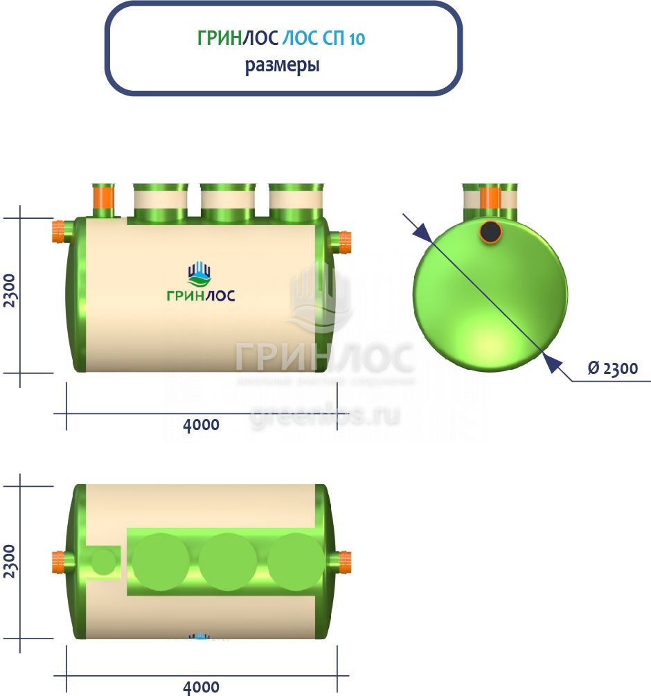 ГРИНЛОС Ливневая канализация 10-2300 стеклопластиковая представляет собой очистное сооружение ливневых стоков габаритами 4000*2300*2300 мм - 1 корпус. Общий объем корпусов составляет 16.6 м3. Для установки станции потребуется применение вспомогательного оборудования.