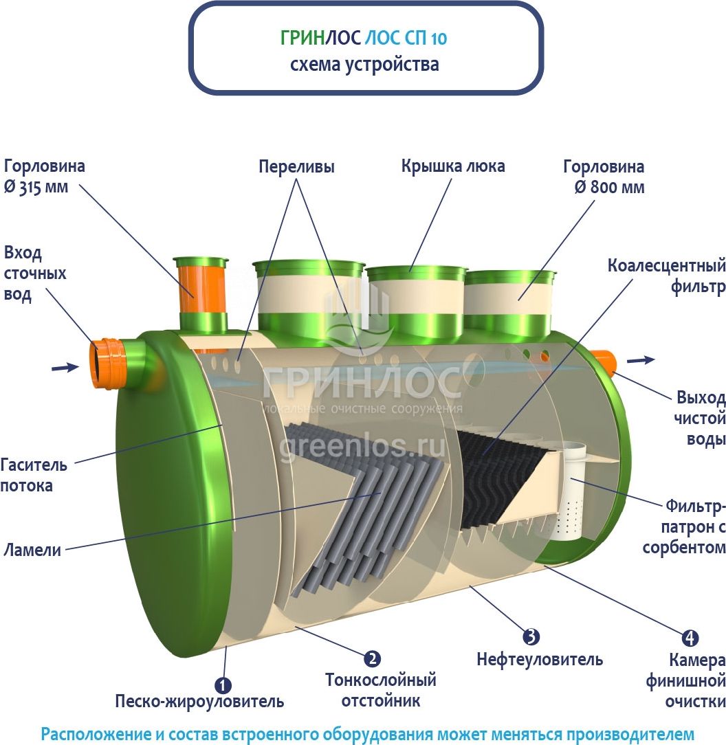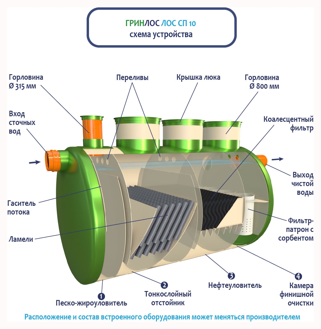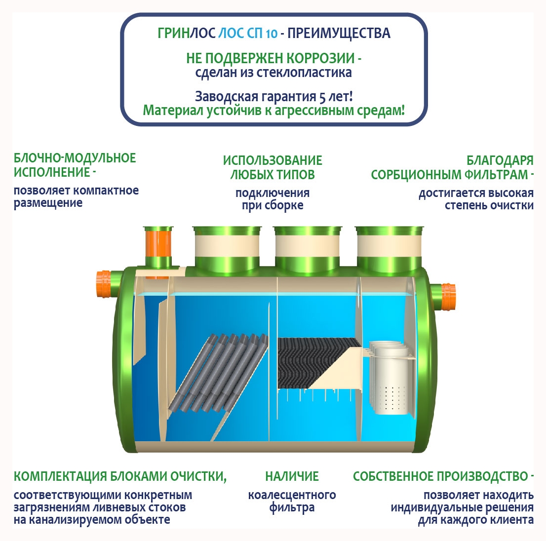 В базовую комплектацию Ливневой канализации Гринлос входит нефтеловушка, которая работает по принципу отстаивания стоков