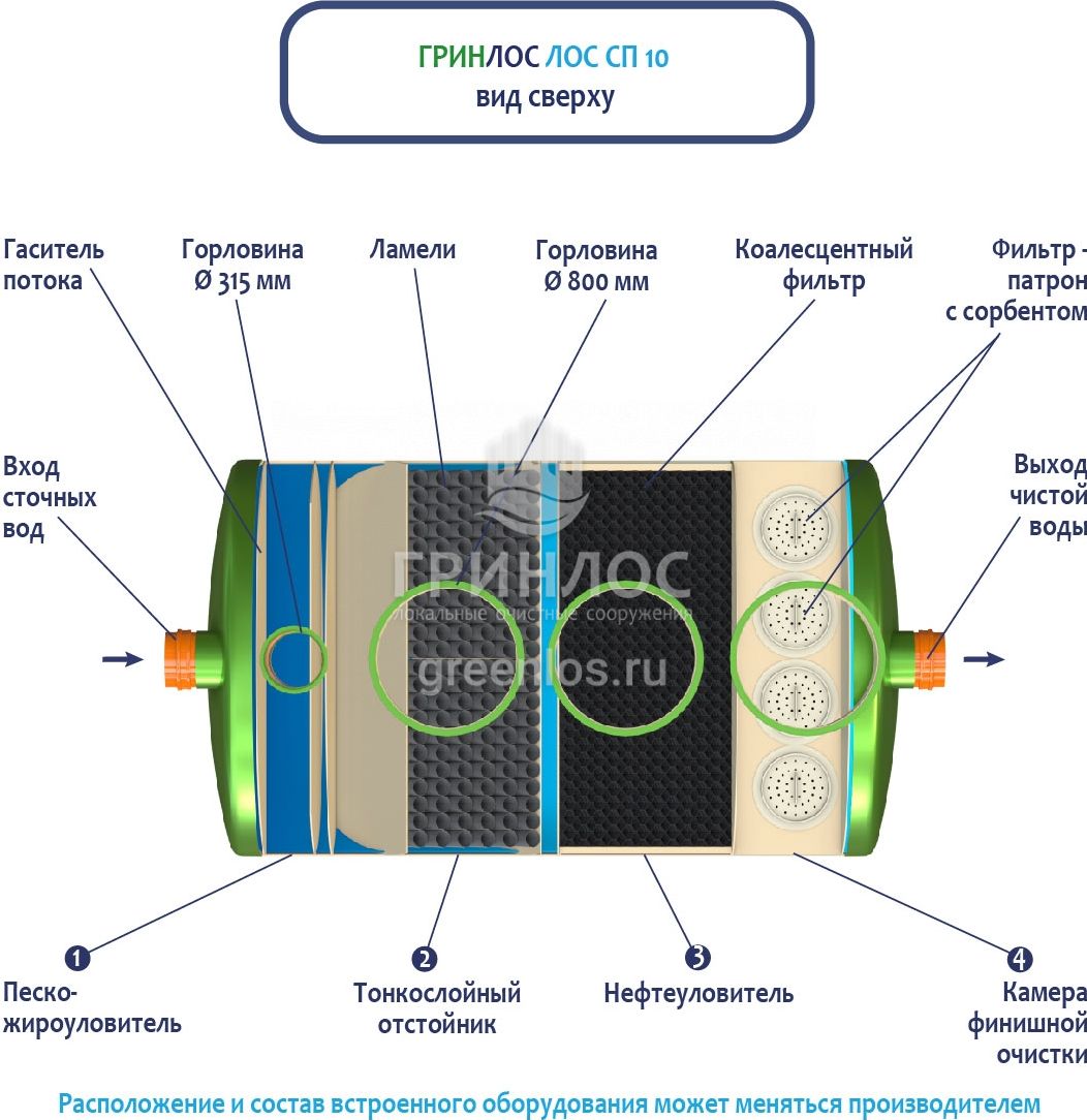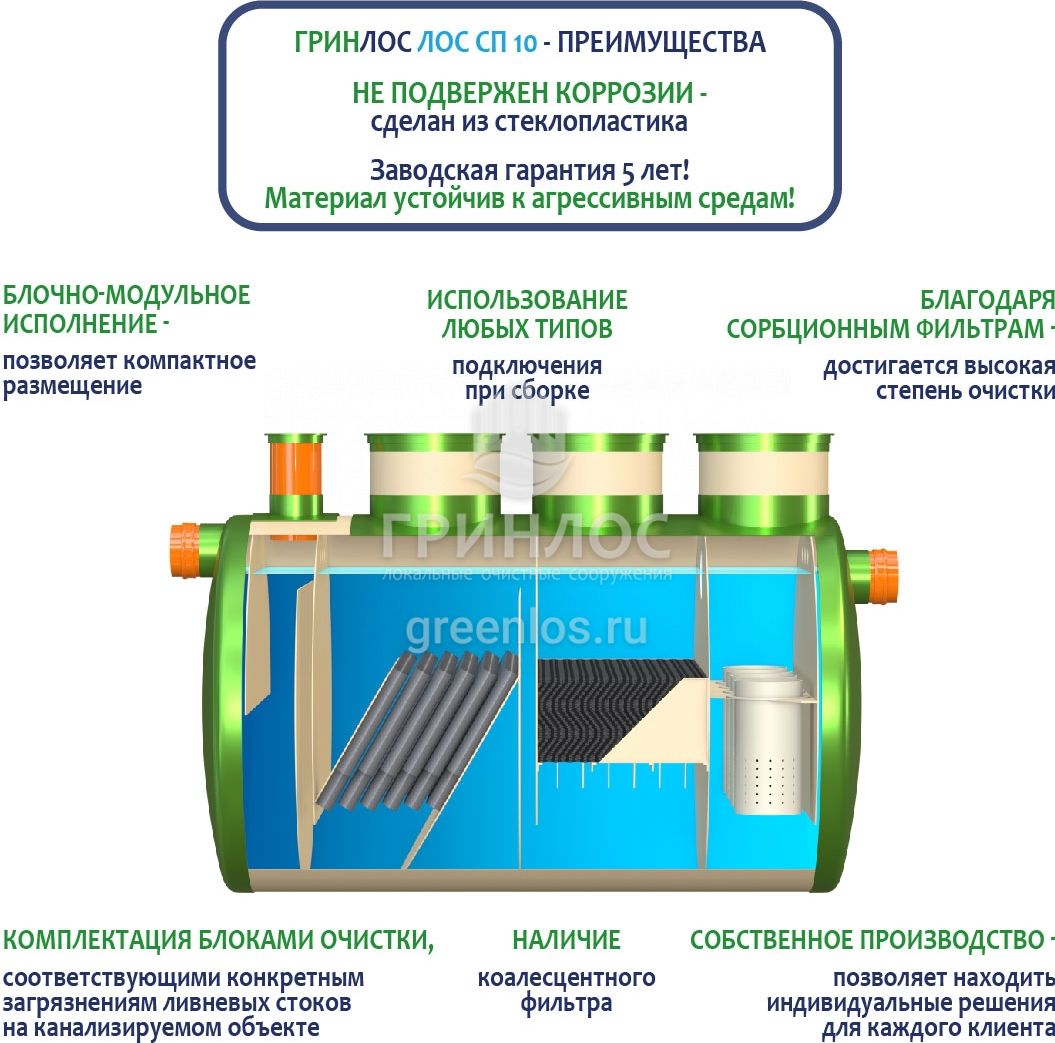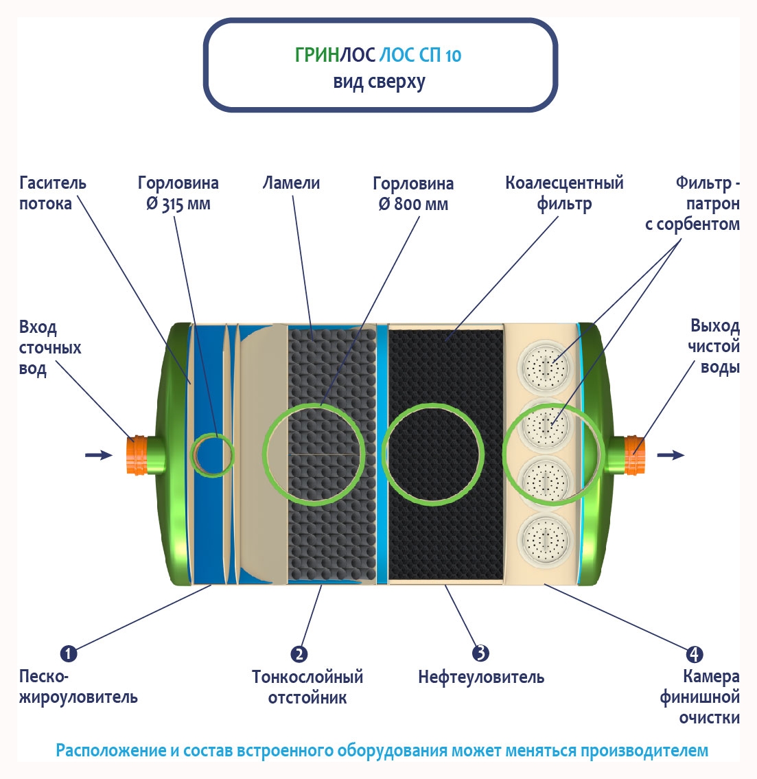 В базовую комплектацию Ливневой канализации Гринлос входит нефтеловушка, которая работает по принципу отстаивания стоков
