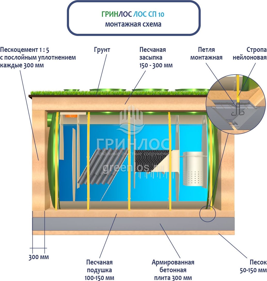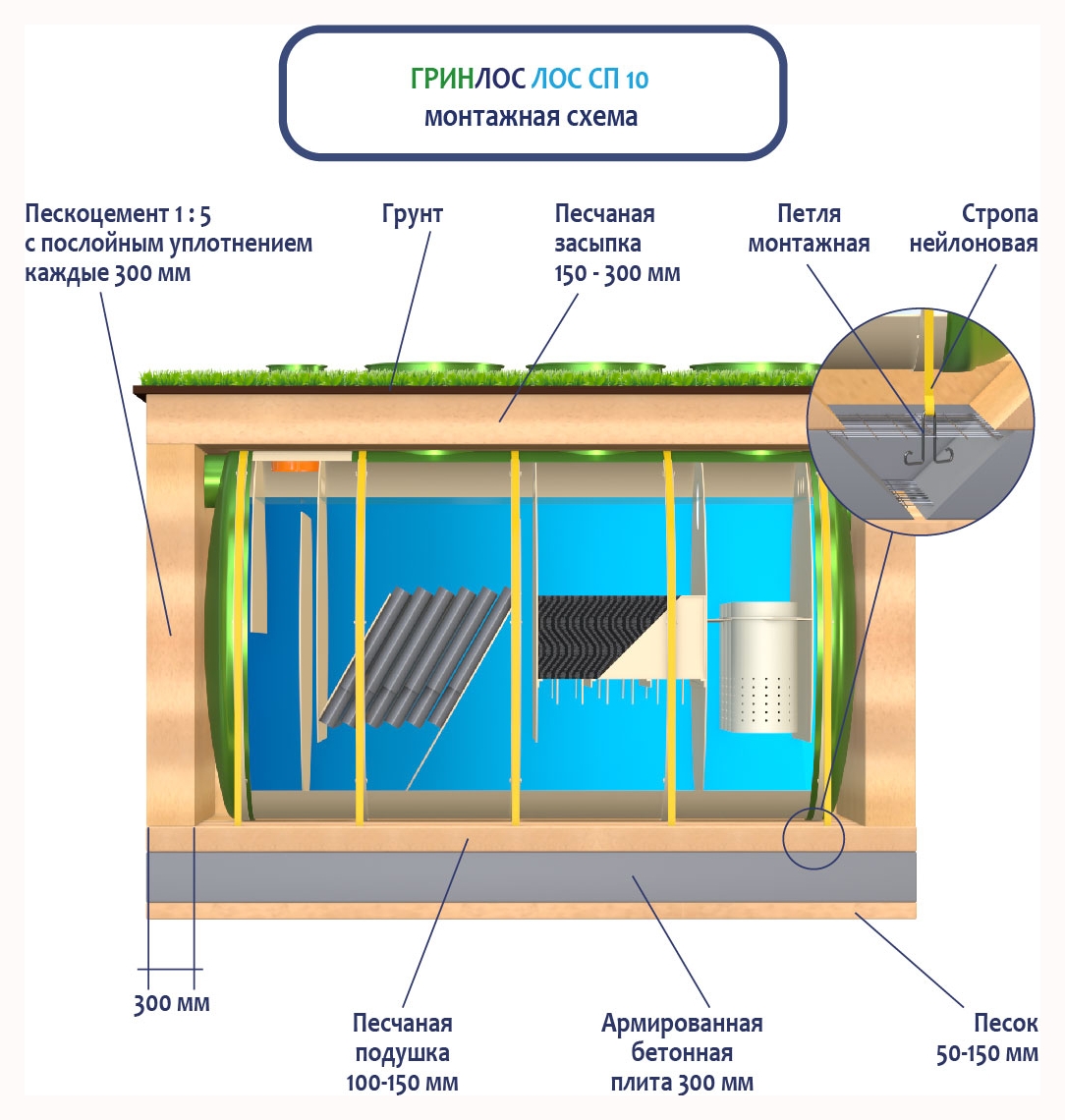 При заглублении ЛОС из стеклопластика на глубину не более 250 мм от верхнего пластикового горизонтального перекрытия до запланированного уровня земли, в однородных грунтах с низким уровнем вод обратную обсыпку допустимо производить песком, смешанным с цементом (марка не ниже М500). Соотношение цемента и песка для обсыпки составляет 1:5. Песчано-цементная засыпка производится послойно, с обязательным трамбованием и проливкой водой каждого слоя. Толщина каждого слоя 300 мм. При условии уровня грунтовых вод выше 1500 мм от уровня земли, при наличии плывуна, скальных грунтов и прочих нестандартных ситуациях, а также в случае заглубления ЛК 10-2300 Сп более чем на 250 мм песчано-цементную смесь необходимо заменить бетоном. Одновременно с засыпкой ливневой канализации, она заполняется водой. Уровень воды должен превышать уровень засыпки (бетонирования) не менее, чем на 200 мм и не более, чем на 500 мм.