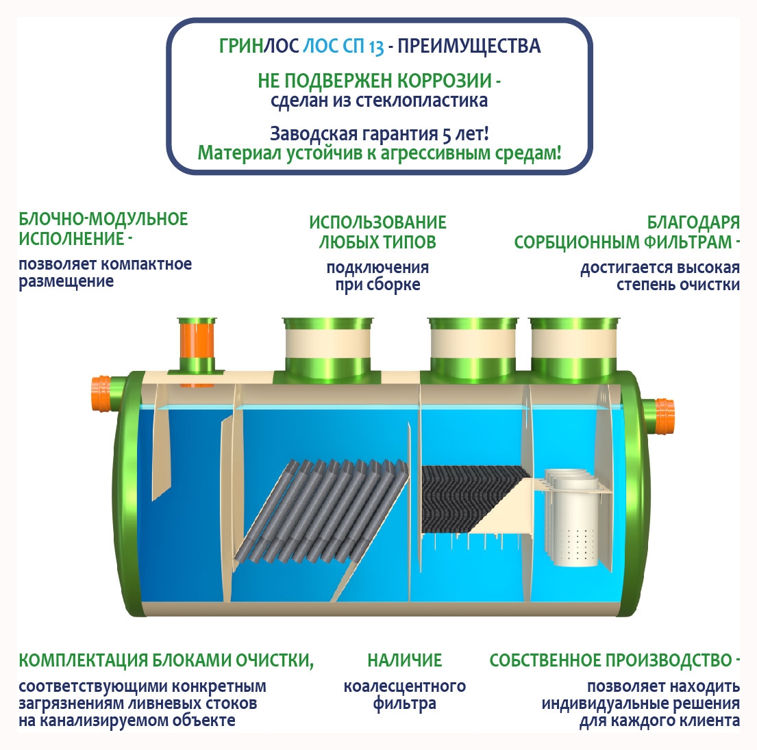 В базовую комплектацию Ливневой канализации Гринлос входит нефтеловушка, которая работает по принципу отстаивания стоков